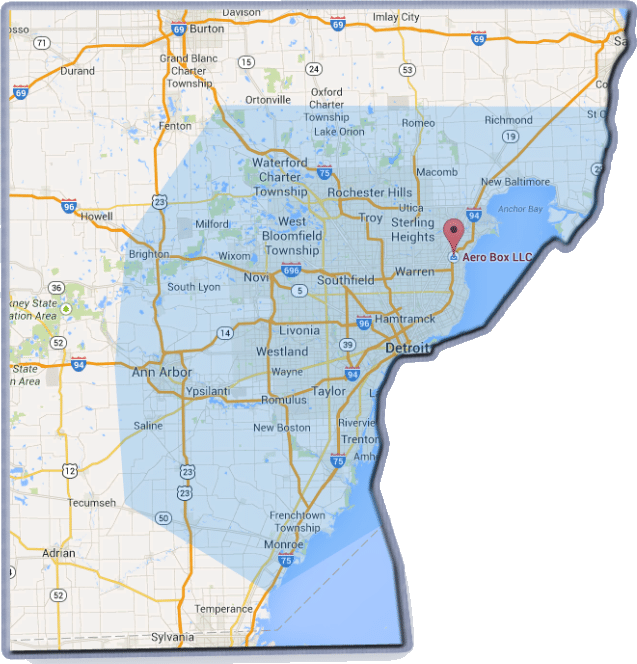 Aero Box, LLC uses its own fleet of trucks to ensure a timely delivery to our customers. Our routes take us to most areas in Metro Detroit (reference map below). We also accept common carriers and can load dock-height vehicles or vehicles with lower beds. If you have questions on whether or not we can ship to you, please contact our Customer Service department to discuss shipping options. We are also versed in international shipping and currently have customers in both Mexico and Canada!